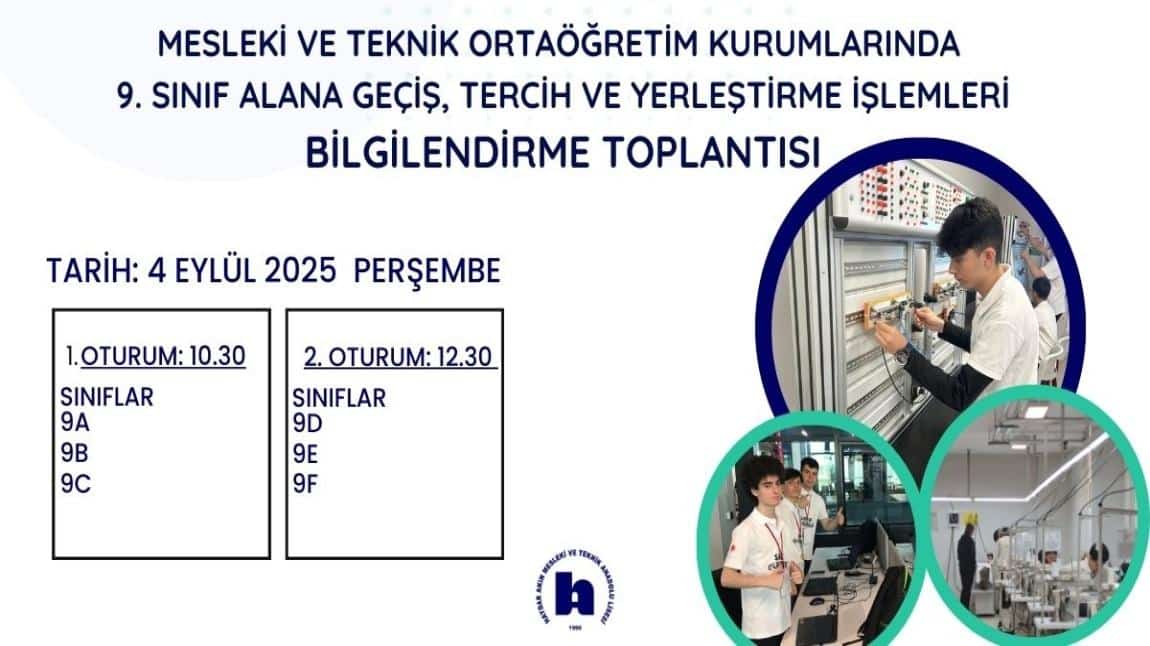 Okulumuz Anadolu Meslek Programı’na 2025-2026 Eğitim-Öğretim Yılı’nda yeni kayıt yapan 9. sınıfların bölüm tercihleri hakkında bilgilenmeleri için velilerimize yönelik okulumuz konferans salonunda 4 EYLÜL 2025 Perşembe günü BİLGİLENDİRME TOPLANTISI düzenlenecektir.